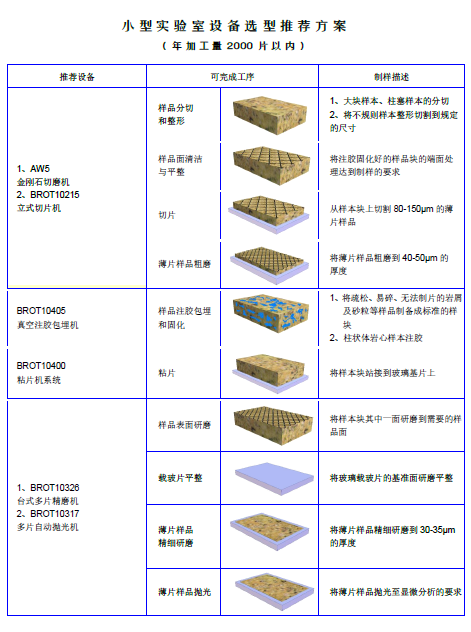 1、礦物地質(zhì)制樣小型實(shí)驗(yàn)室解決方案,是針對年常規(guī)生產(chǎn)薄片量在2000片以內(nèi)的薄片制備方法以及相關(guān)設(shè)備。這些方法和設(shè)備保證用戶可以得到非常高質(zhì)量的薄片,同時(shí)也可以滿足大量樣品的分析要求。