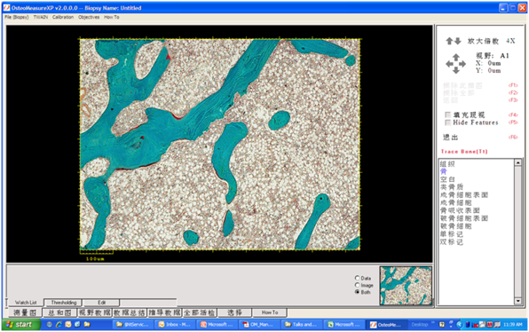 3) 功能性:全景展示;大圖像瀏覽;連續(xù)追蹤樣品多個(gè)視野;進(jìn)行骨小梁、皮質(zhì)骨等骨樣的研究;自動(dòng)測(cè)量骨樣寬度、骨樣的厚度計(jì)算、自動(dòng)機(jī)械測(cè)量法、顆粒計(jì)算、自動(dòng)排除邊緣物體、自動(dòng)測(cè)量骨表面、計(jì)算結(jié)果報(bào)告參數(shù)過(guò)濾器、全景展示記錄每一測(cè)量,可計(jì)算平均值及平均標(biāo)準(zhǔn)偏差、自動(dòng)直接地確定標(biāo)線間的距離,無(wú)估計(jì)錯(cuò)誤、樣品偏移及手動(dòng)追蹤、自動(dòng)測(cè)量標(biāo)線寬度。