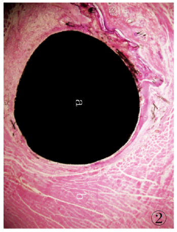 圖2 低倍鏡下埋置有CF/PEEK 復(fù)合材料的肌肉組織病理切片:a.試驗樣品CF /PEEK復(fù)合材料; b. 肌肉組織